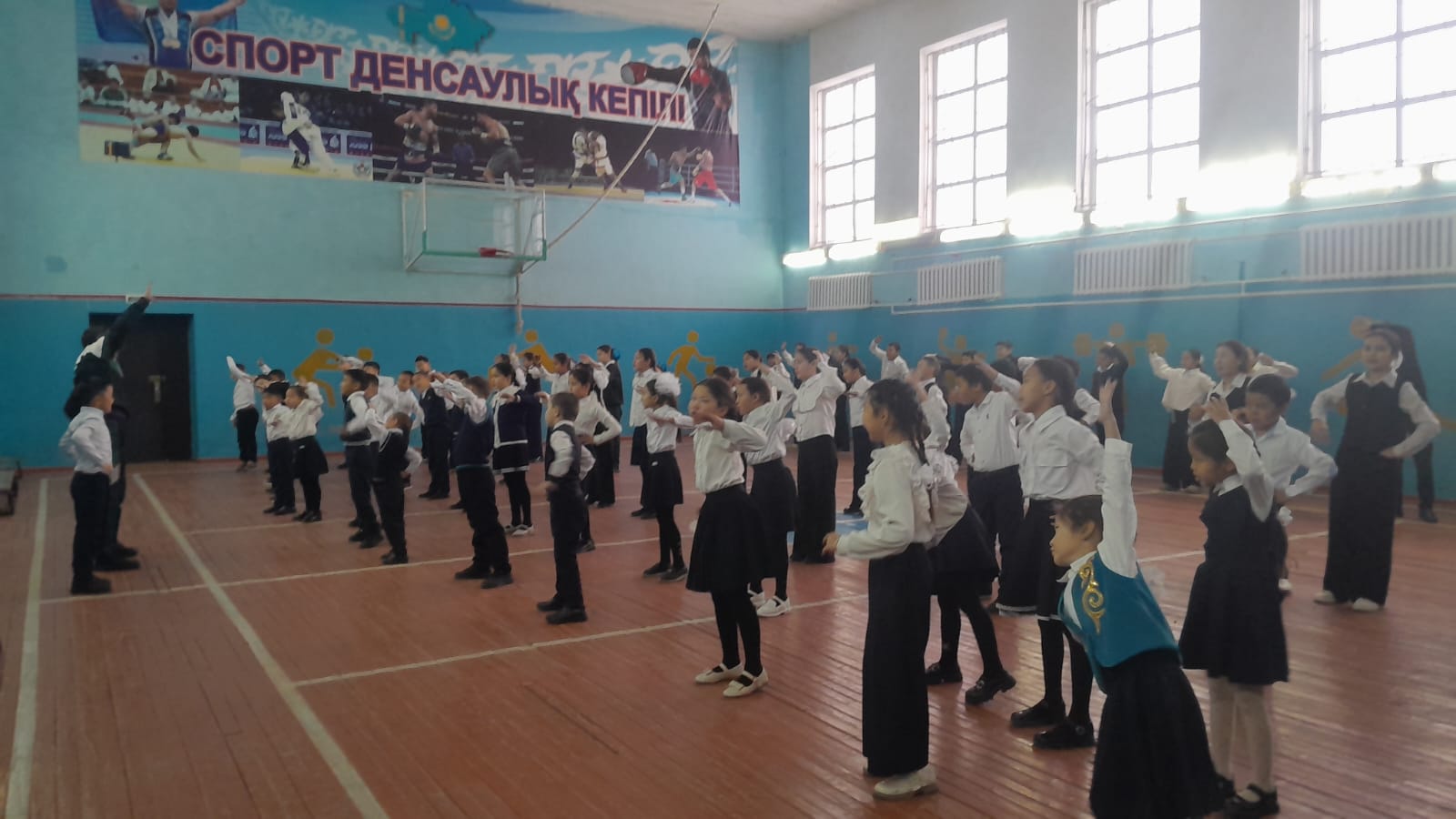 Алға орта мектебінде күнде сабақ басталар алдындағы таңғы жаттығу.